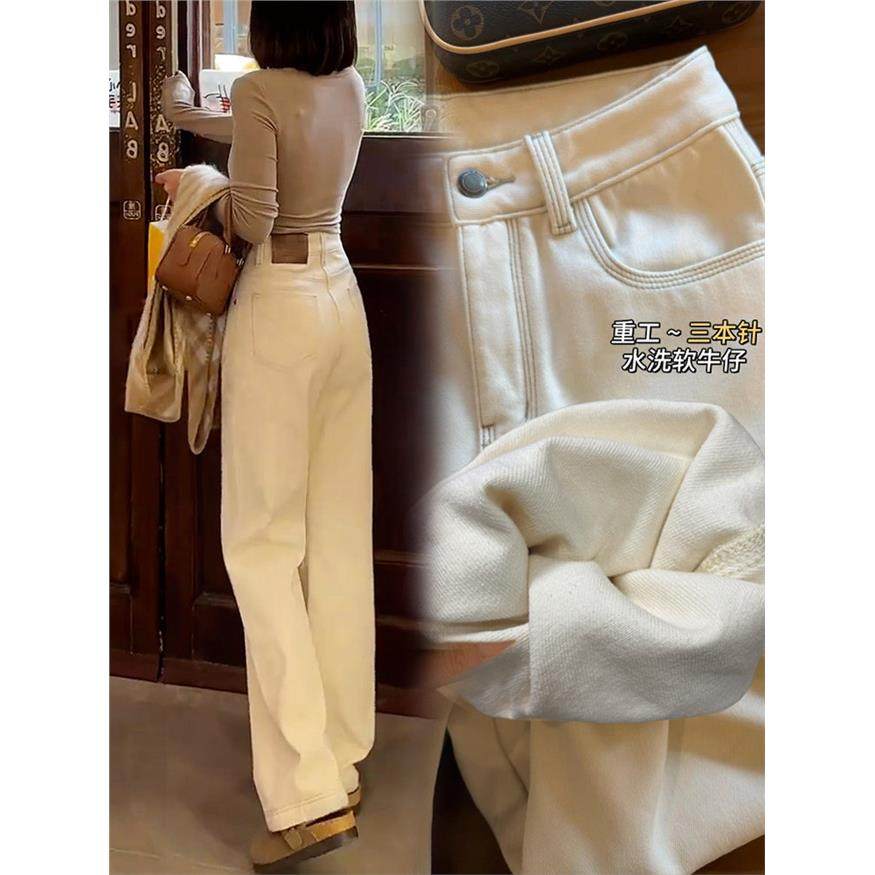 直筒牛仔裤女春秋2025年新款美式覆古米杏色高腰拖地宽松阔腿裤子