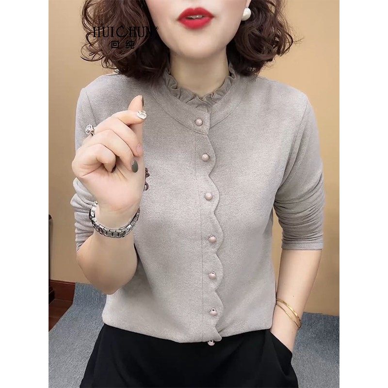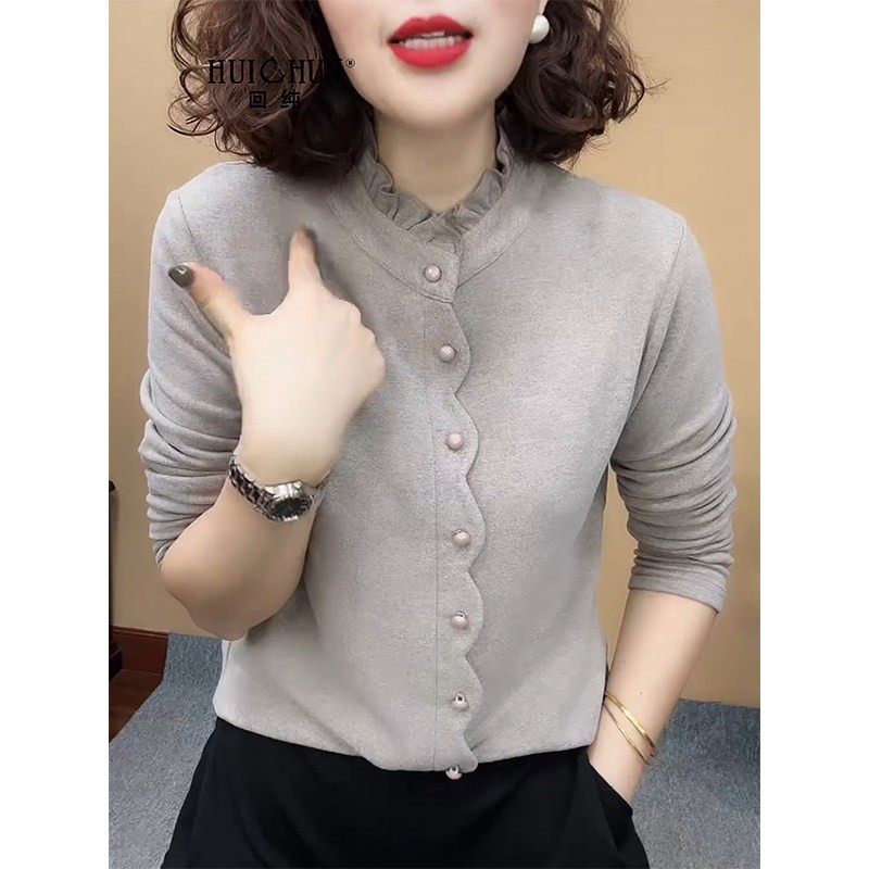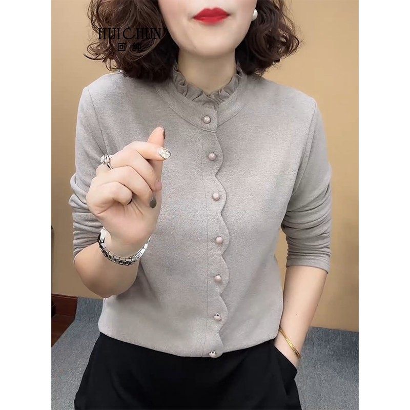 高档德绒衬衫妈妈长袖立领胖mm春装新款洋气上衣百搭打底衫衬衣