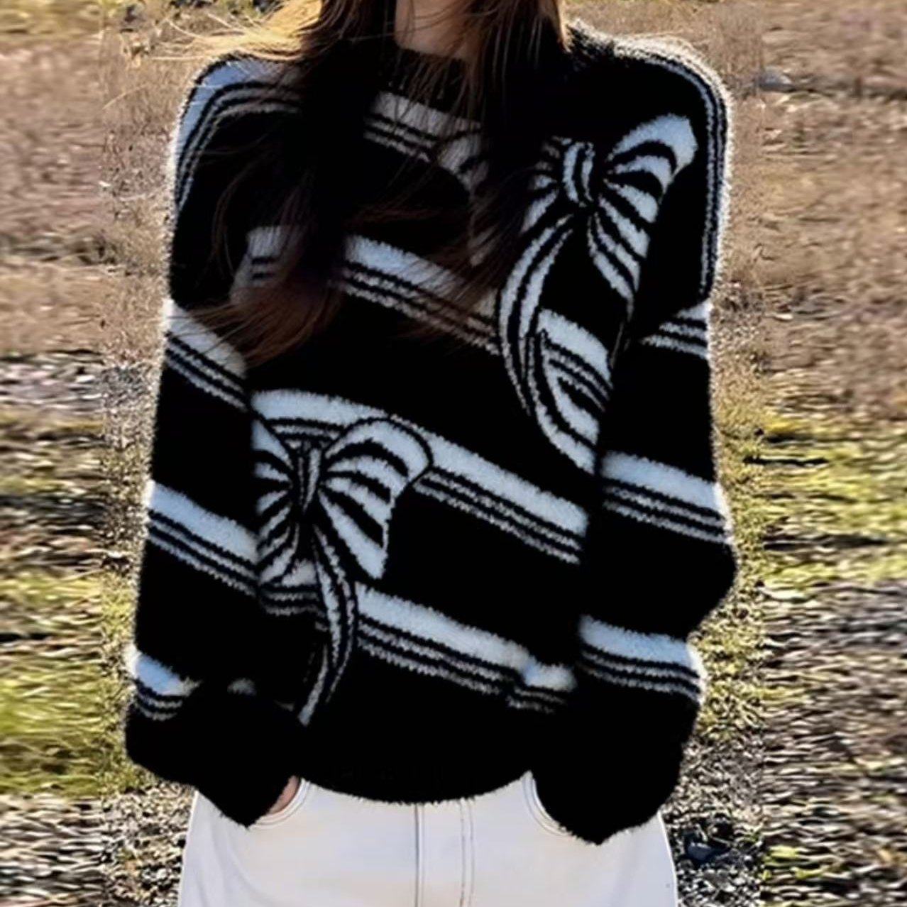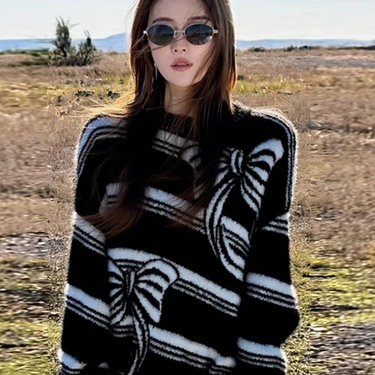 2025秋季新款针织衫奶fufu软糯慵懒风上衣高级感气质黑白撞色毛衣