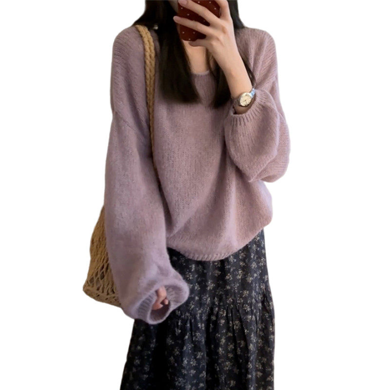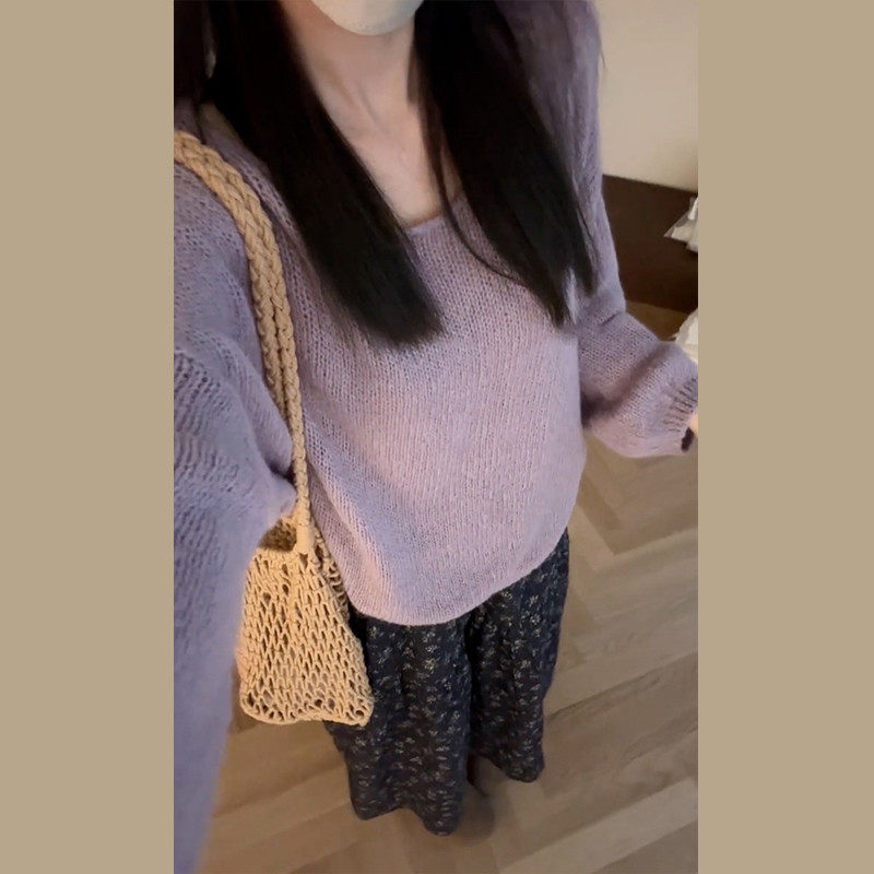韩系小个子碎花洋装女2025慵懒风宽松长袖紫色毛衣初夏穿搭套装