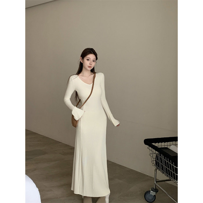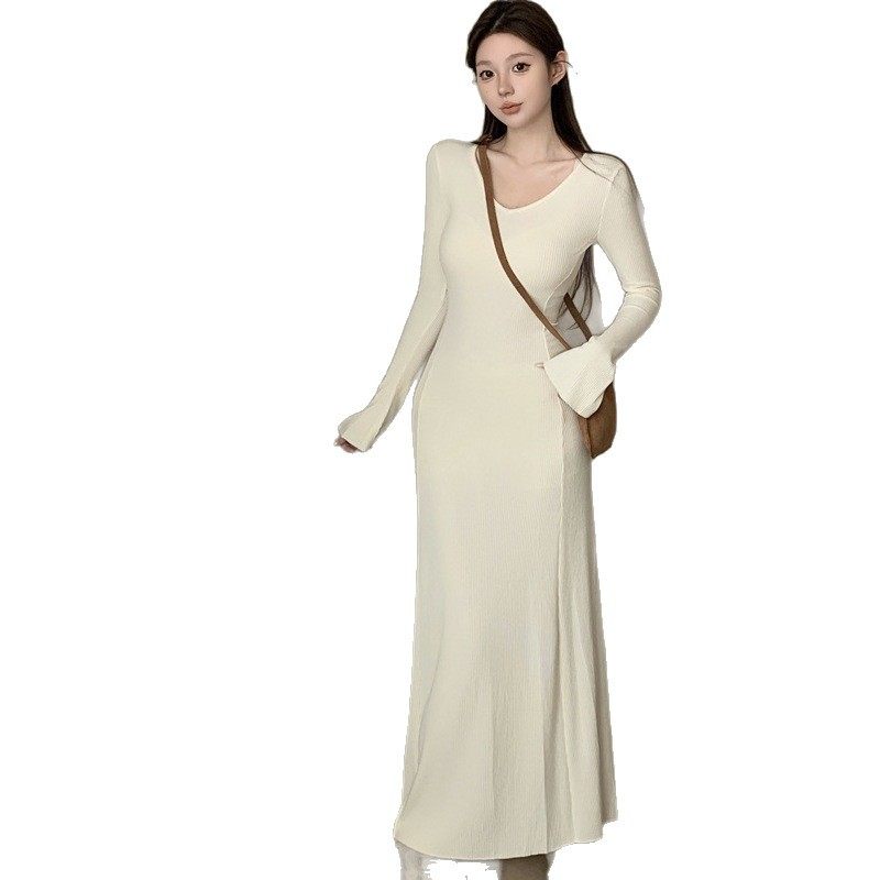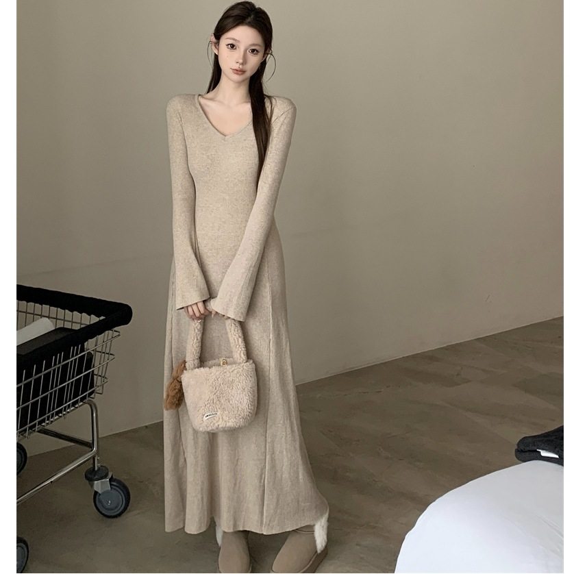 复古喇叭袖V领针织打底连衣裙女秋季新款修身显瘦气质长裙子