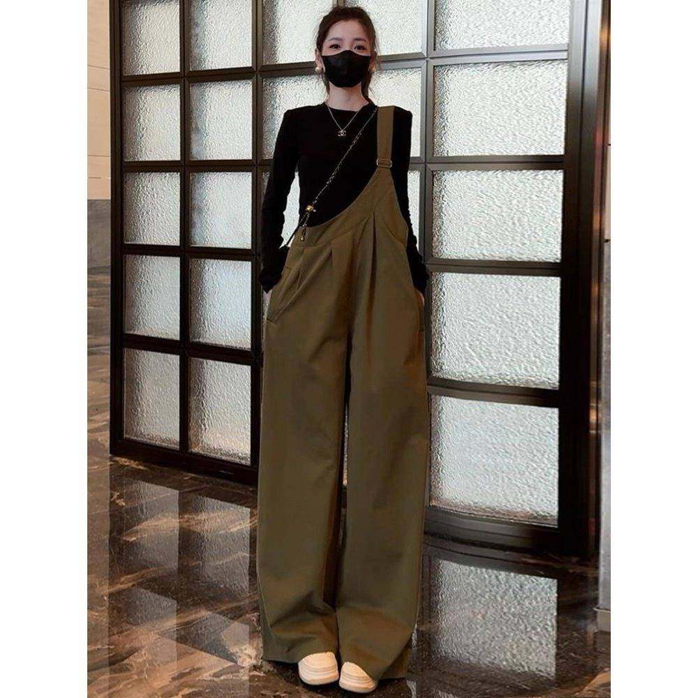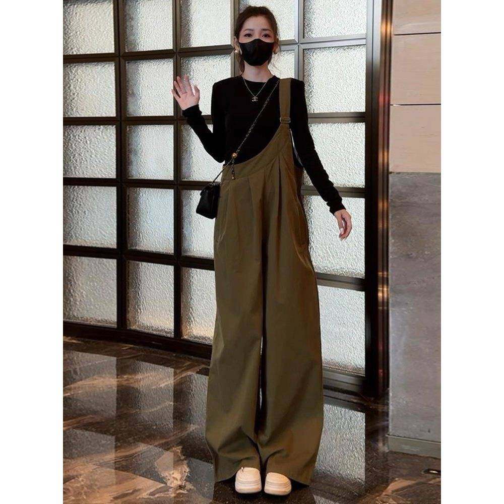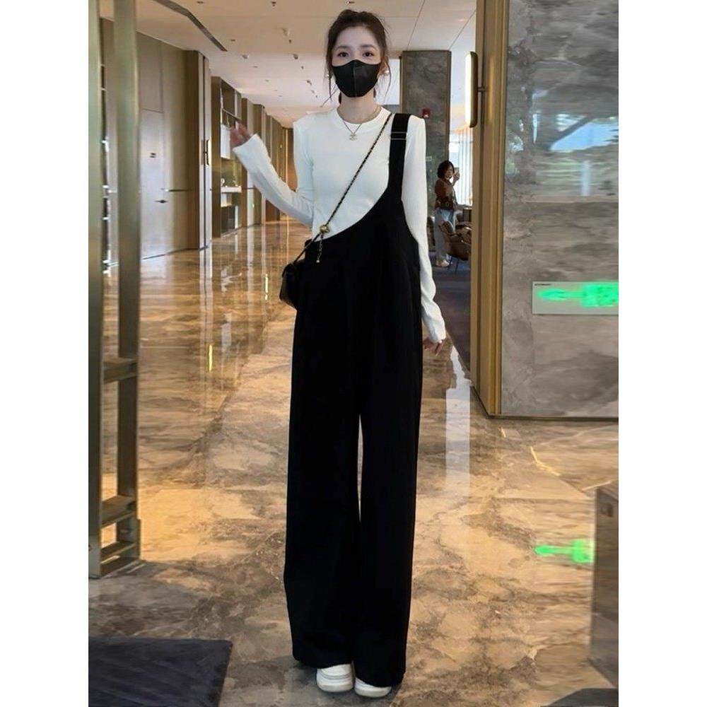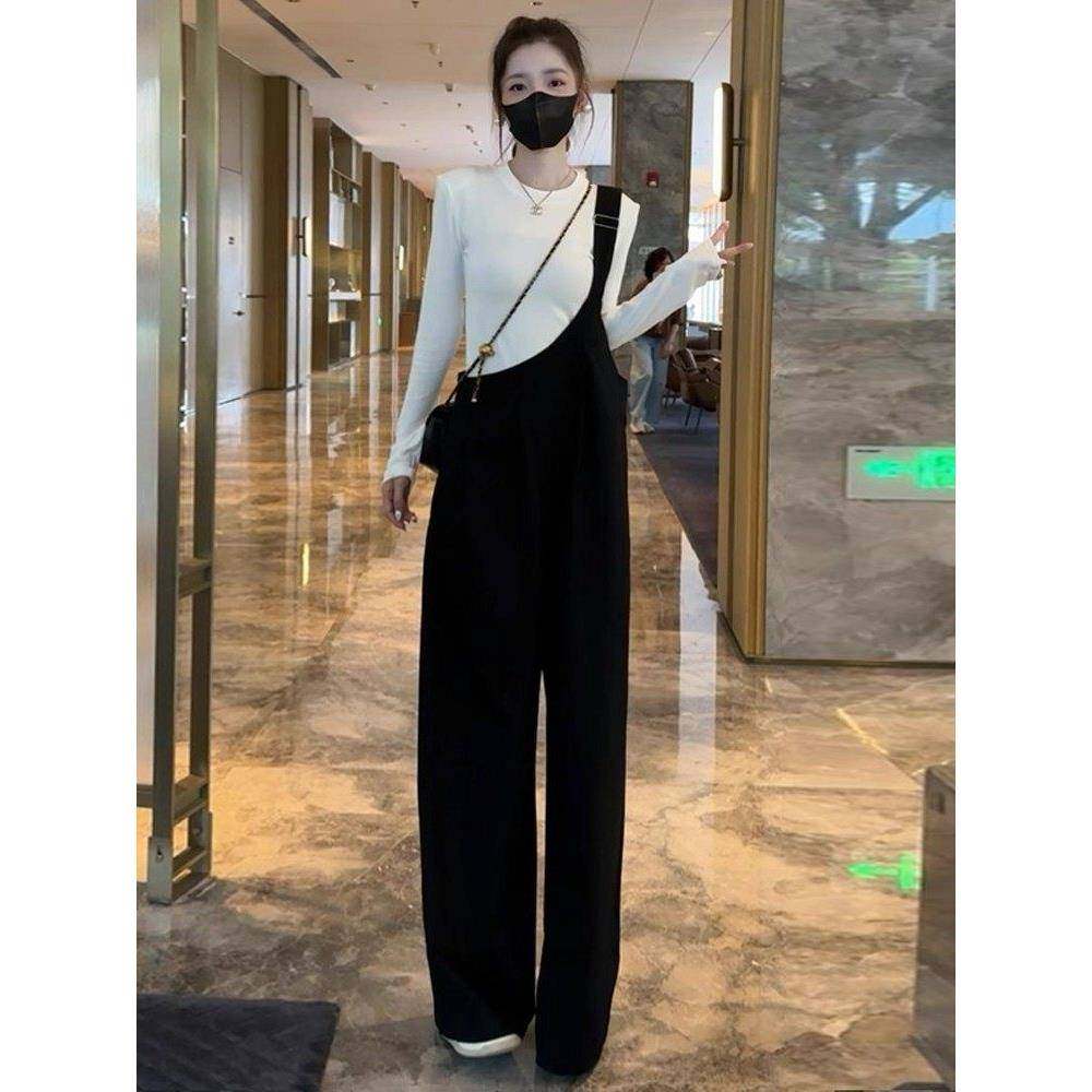 香港代购时尚工装背带裤套装女秋季新款显瘦长袖连体阔腿裤两件套
