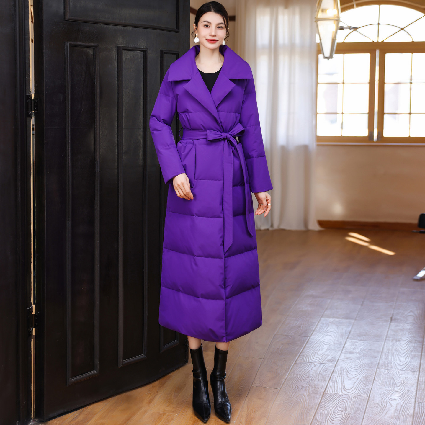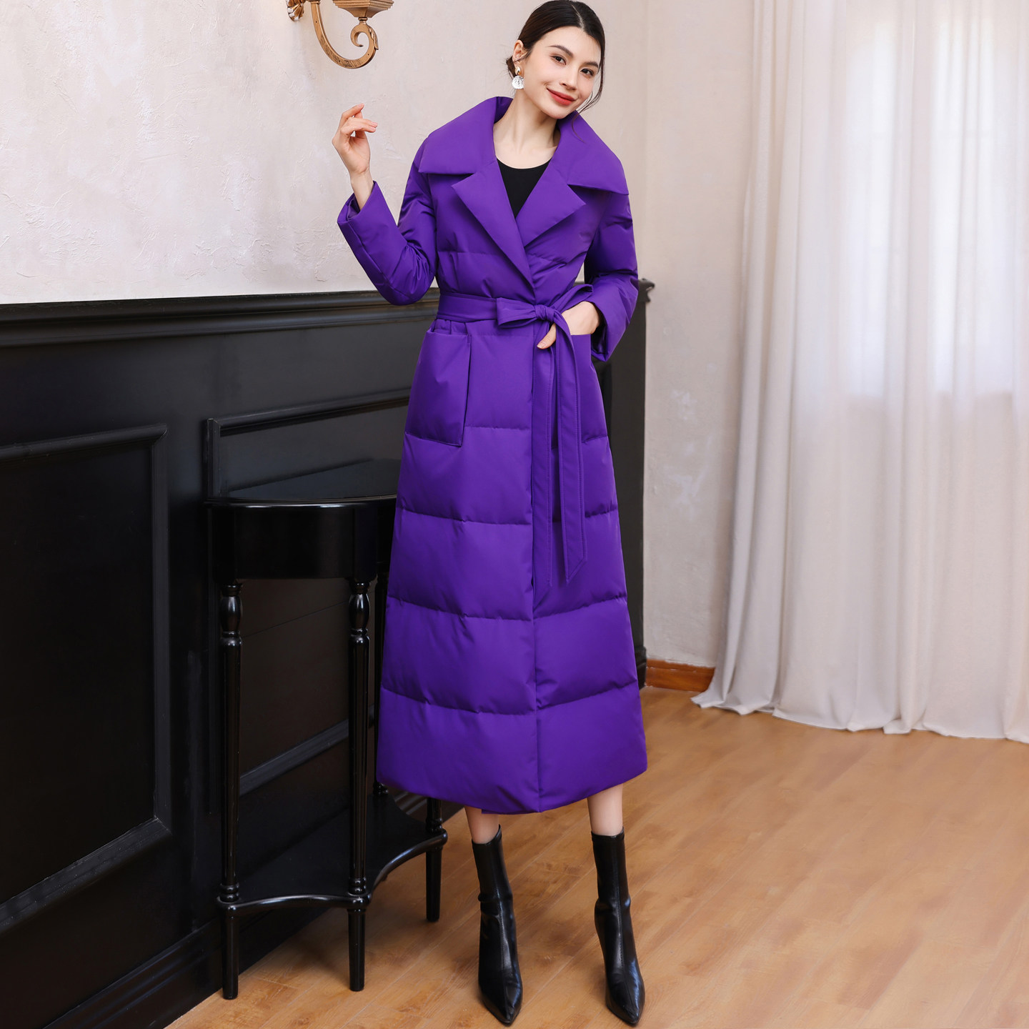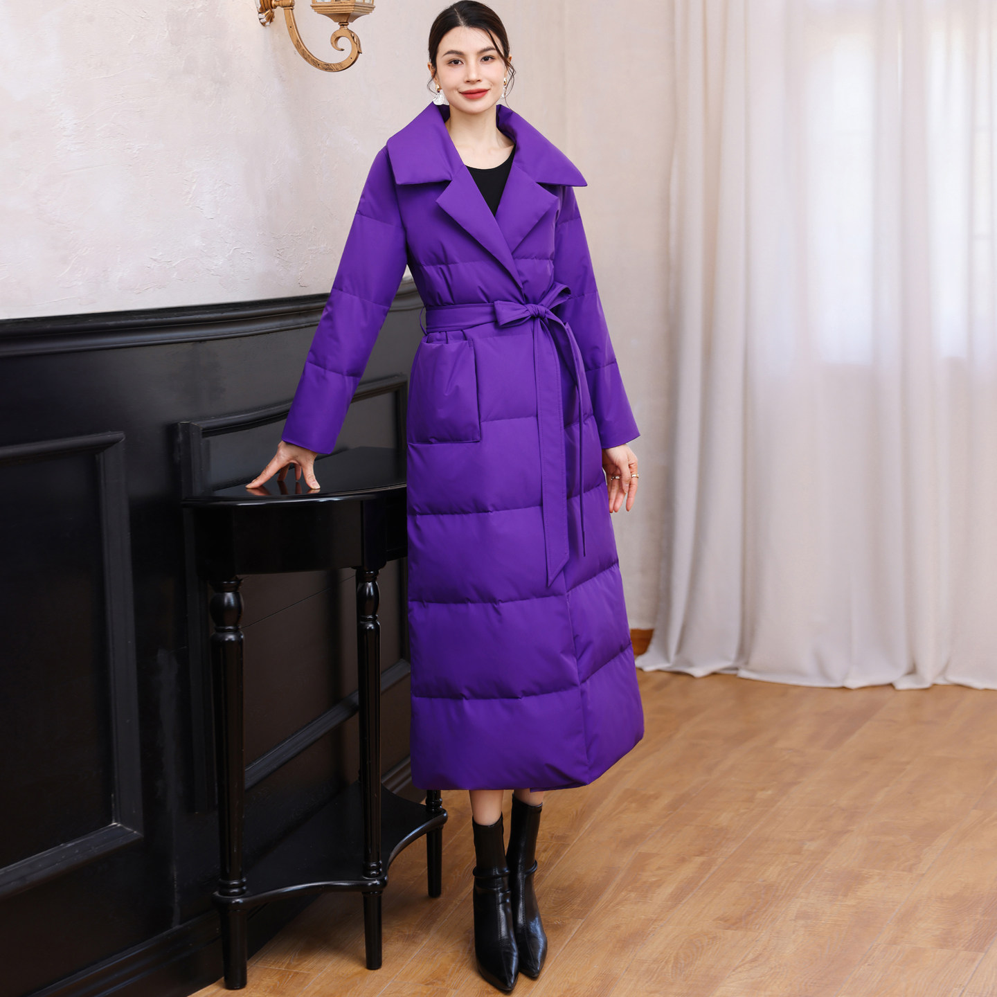 高端大牌西装领过膝白鸭绒修身显瘦加厚保暖紫色羽绒服女长款外套