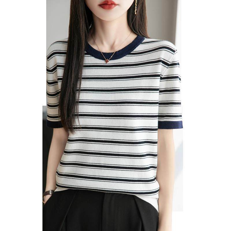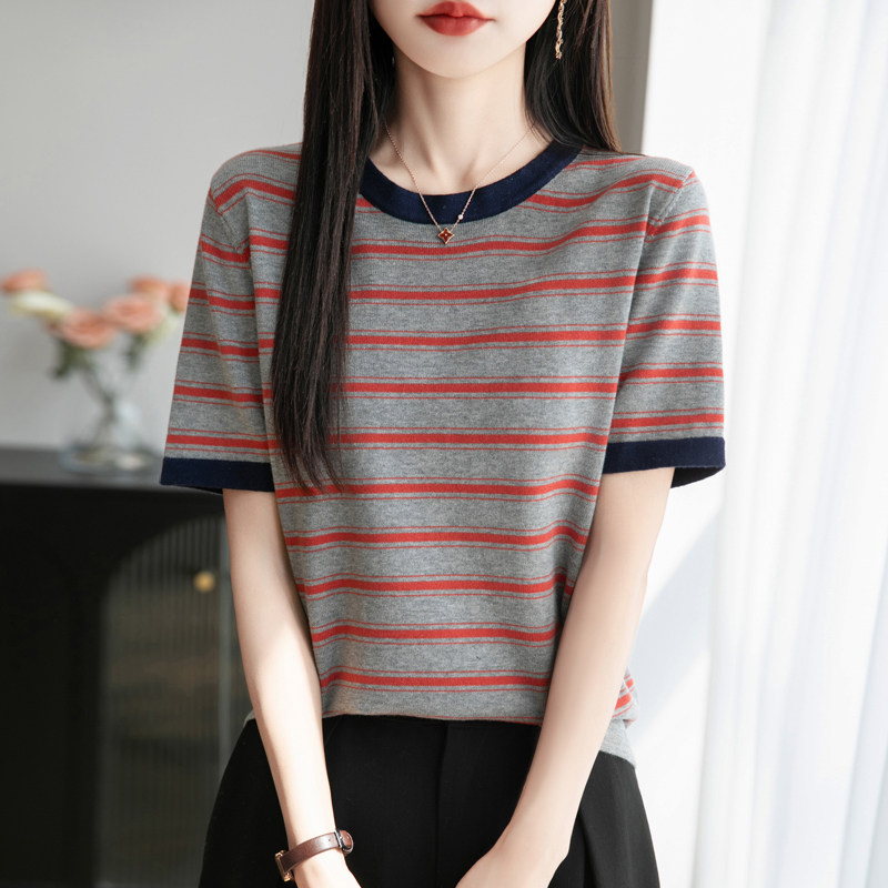 2025新款纯棉拼色园领条纹短袖圆领T恤宽松休闲撞色时尚半袖百搭