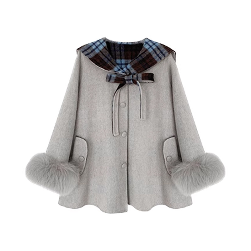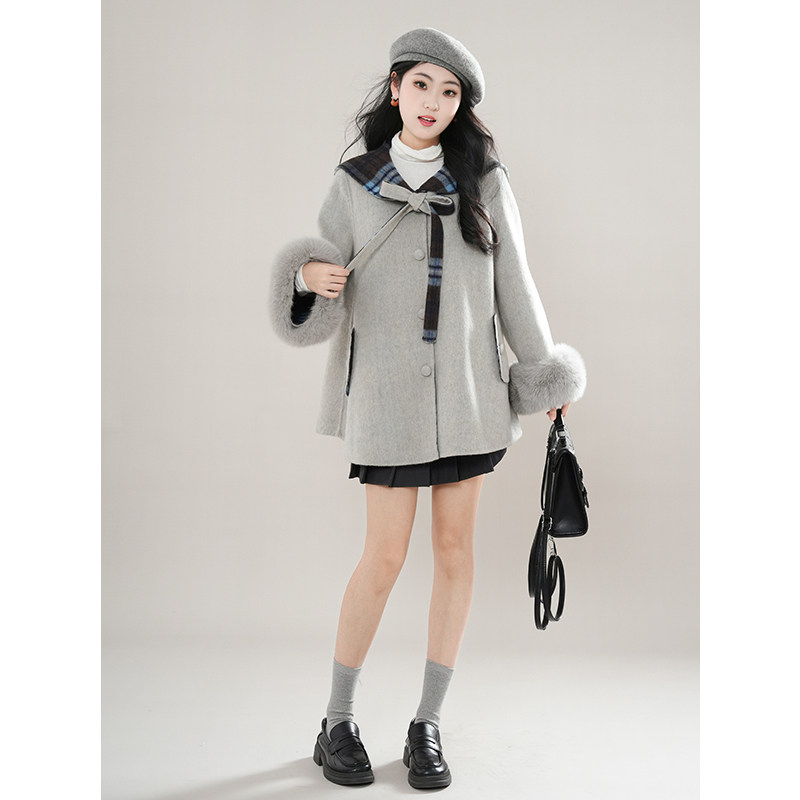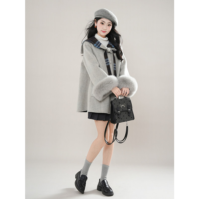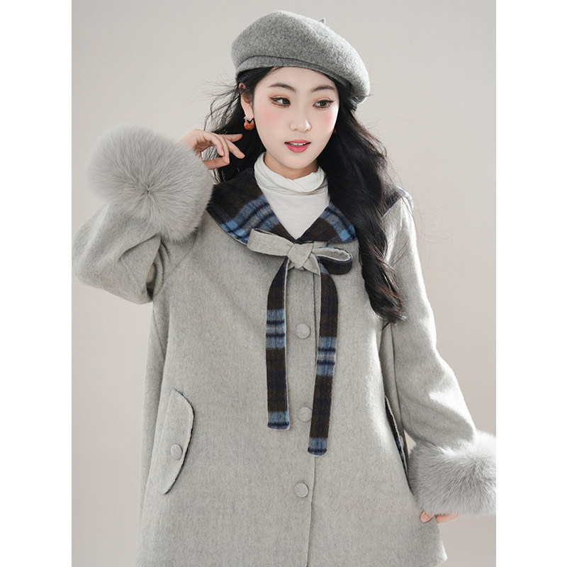 航海艺术家/韩系格子大衣秋冬新款毛毛袖海军领气质夹棉毛呢外套
