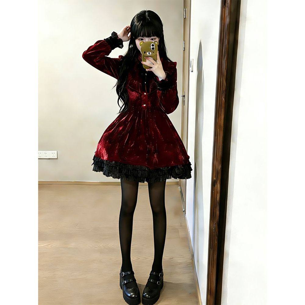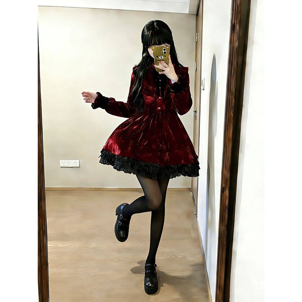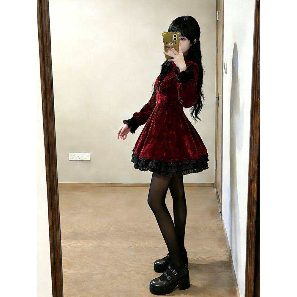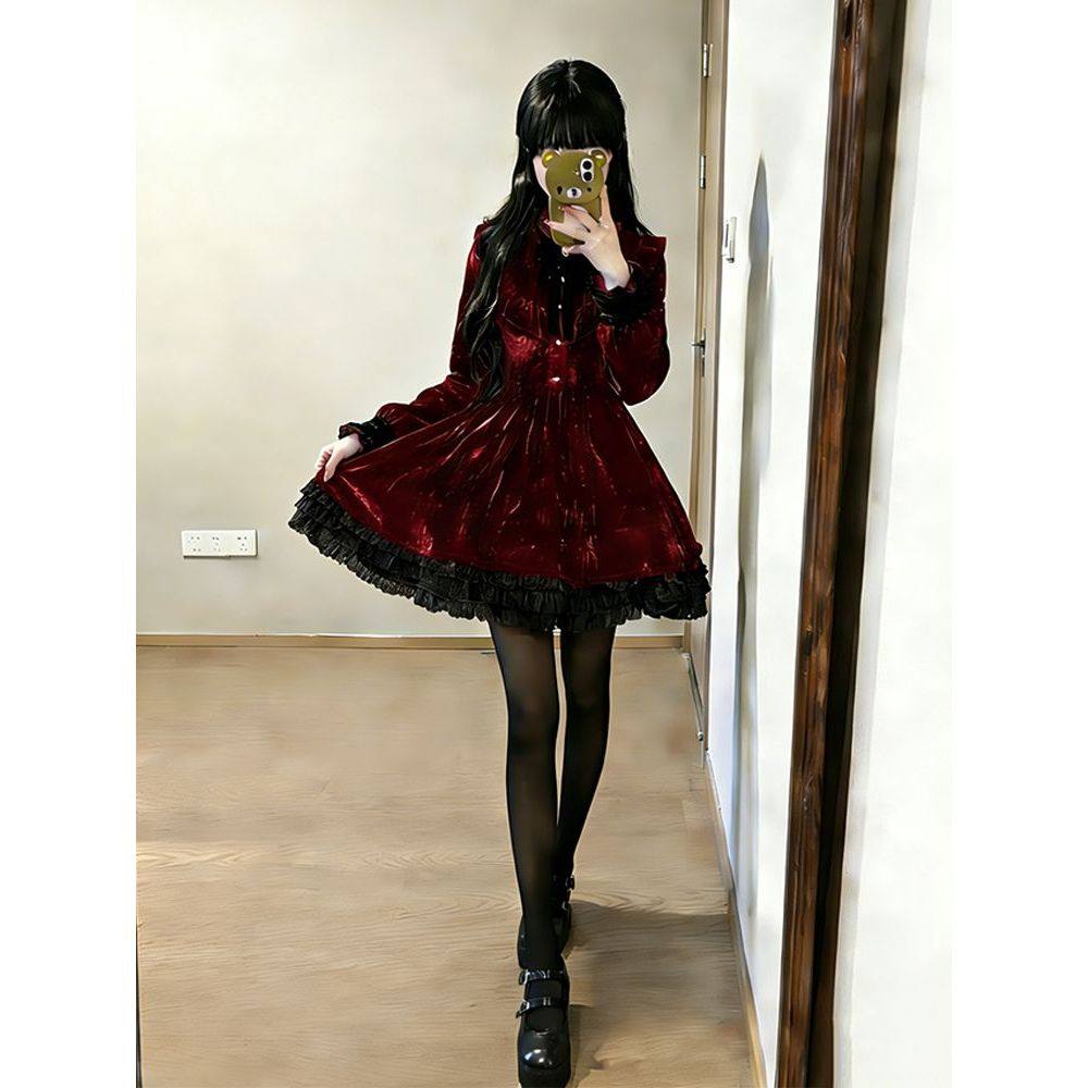 日系Lolita暗黑哥特风doll感血色拼接蝴蝶结天鹅绒长袖连衣短裙女