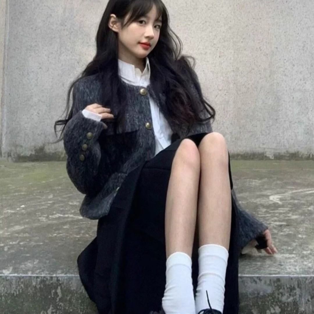 设计感灰色短款小香风毛呢外套女小个子秋冬韩系chic别致长袖上衣