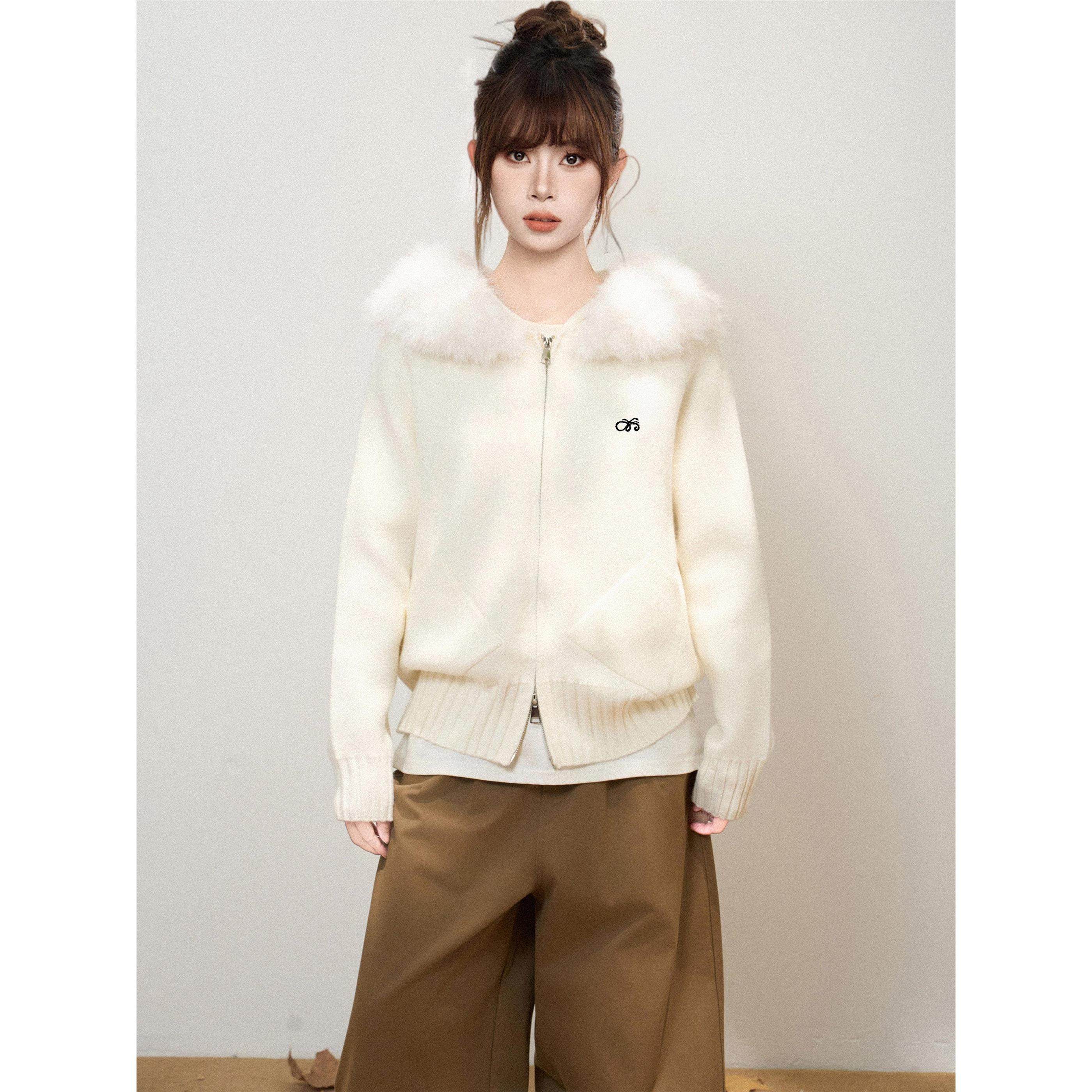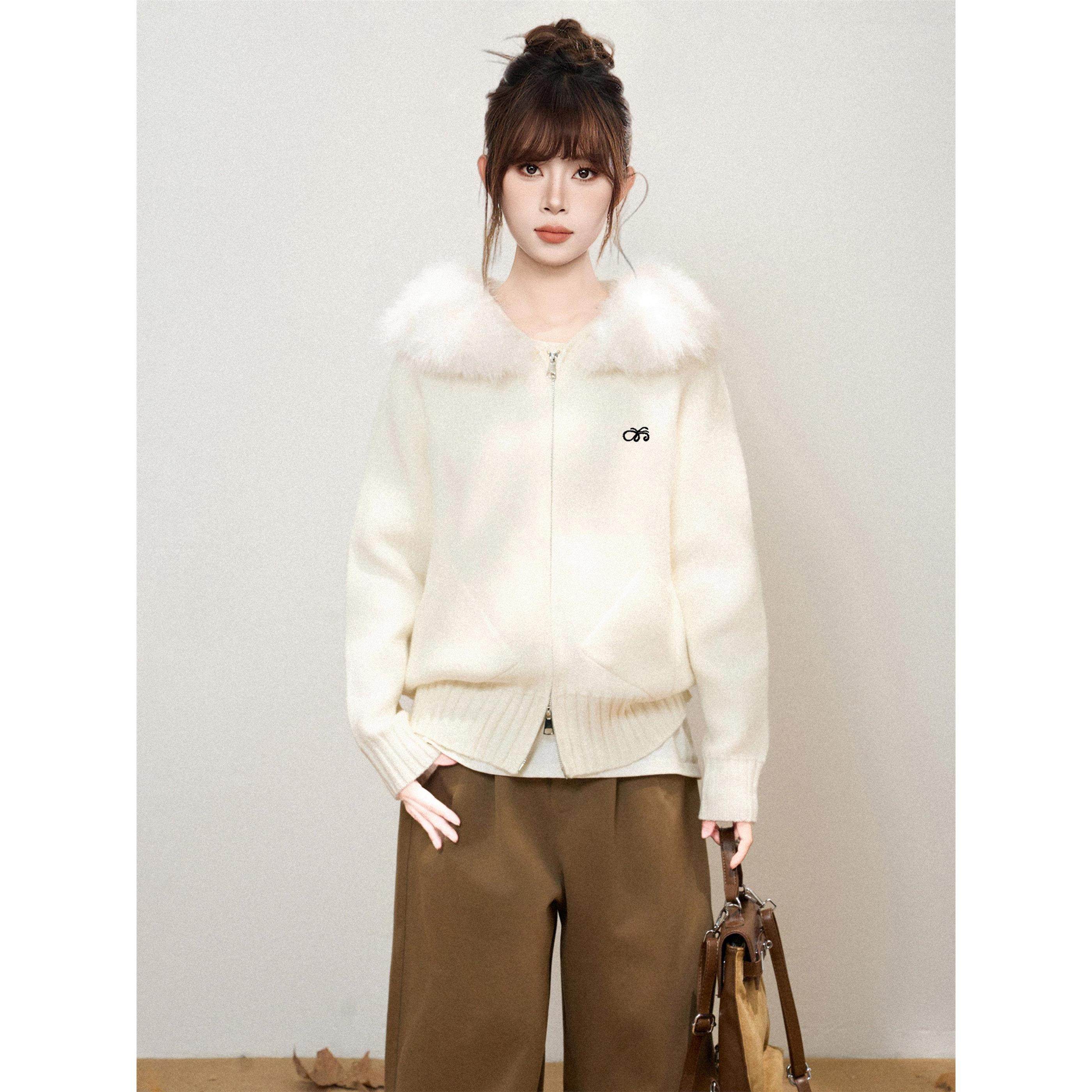 白色毛领连帽双拉炼针织毛衣外套女秋季秋冬宽松外搭开衫卫衣上衣