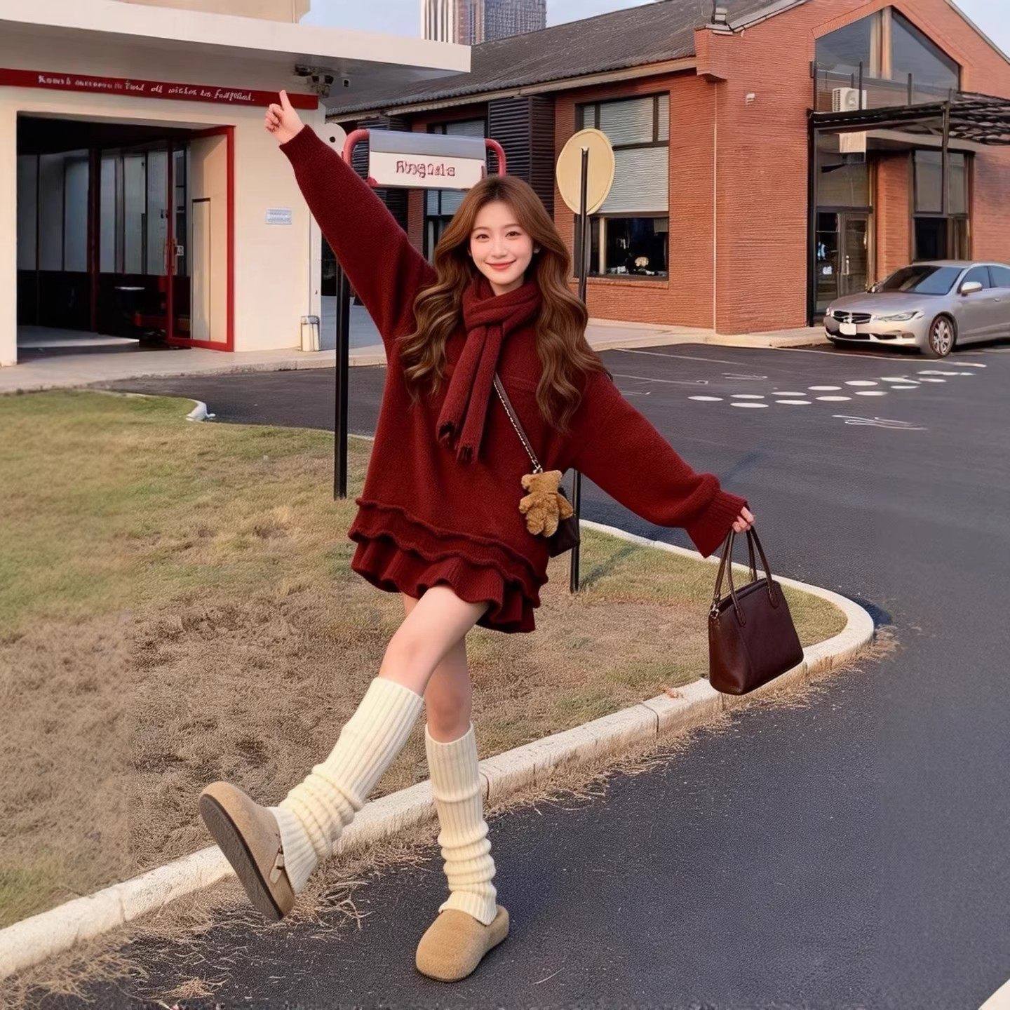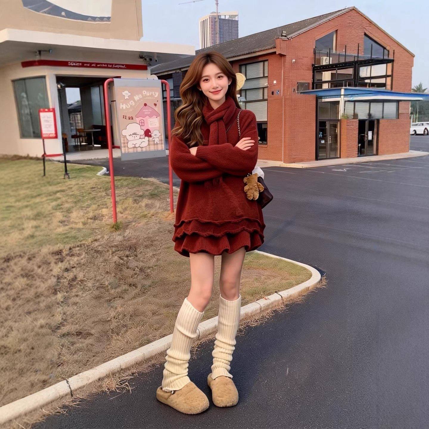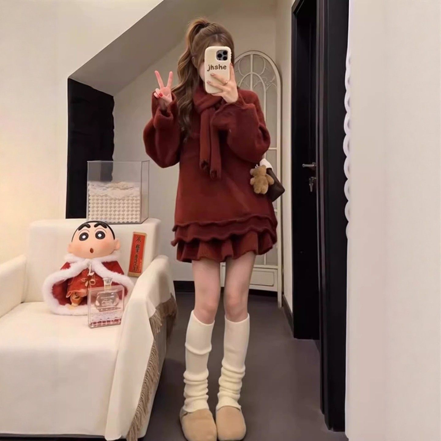 冬装一整套新年战袍红色针织洋装子女氛围感围脖荷叶边短裙套装
