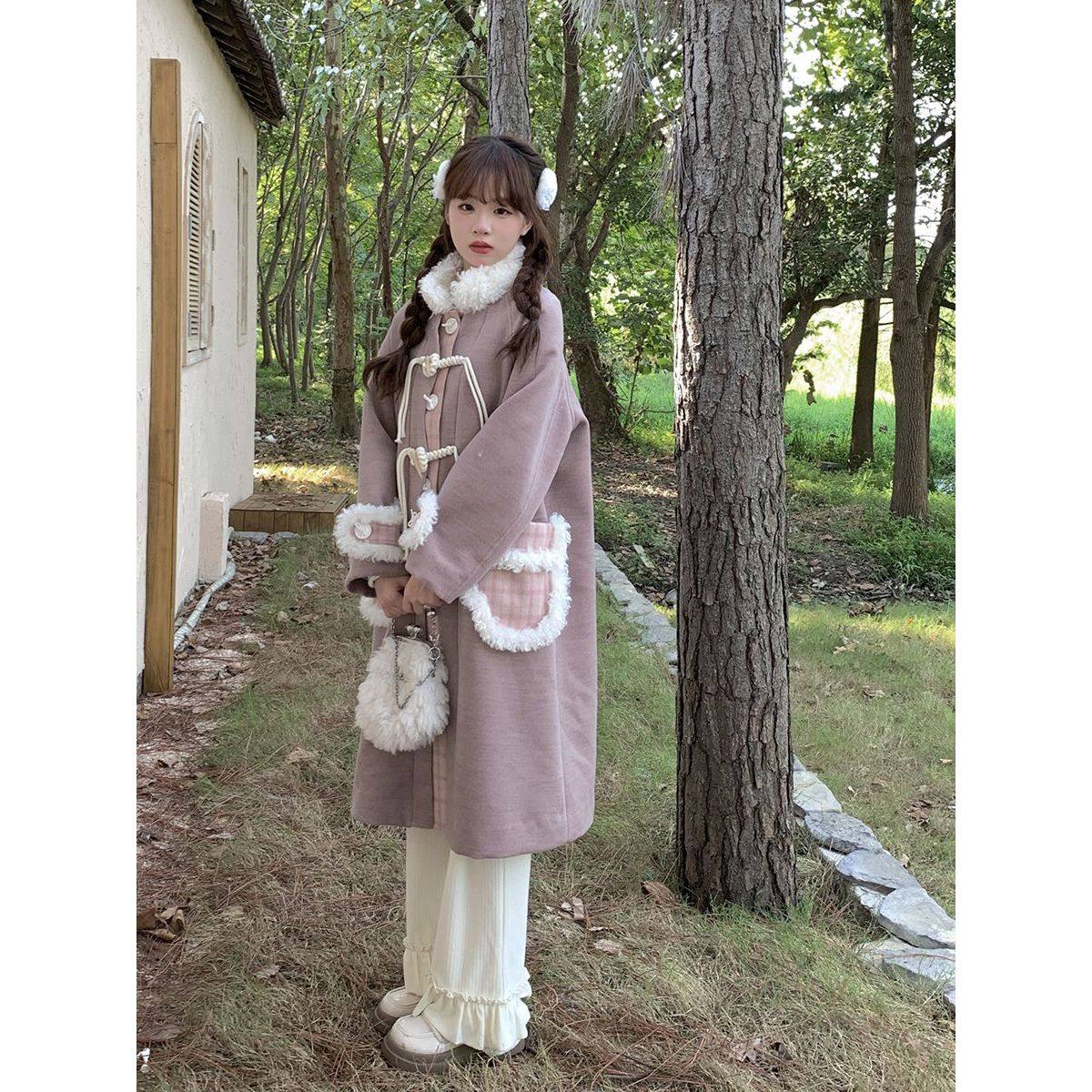 日系甜美拼接毛绒呢子大衣女2025冬季新款小众可爱小个子毛呢外套