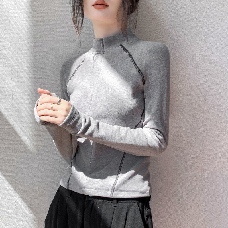 双面德绒无帽卫衣女内搭秋冬新款加绒保暖拉链门襟半高领白色上衣