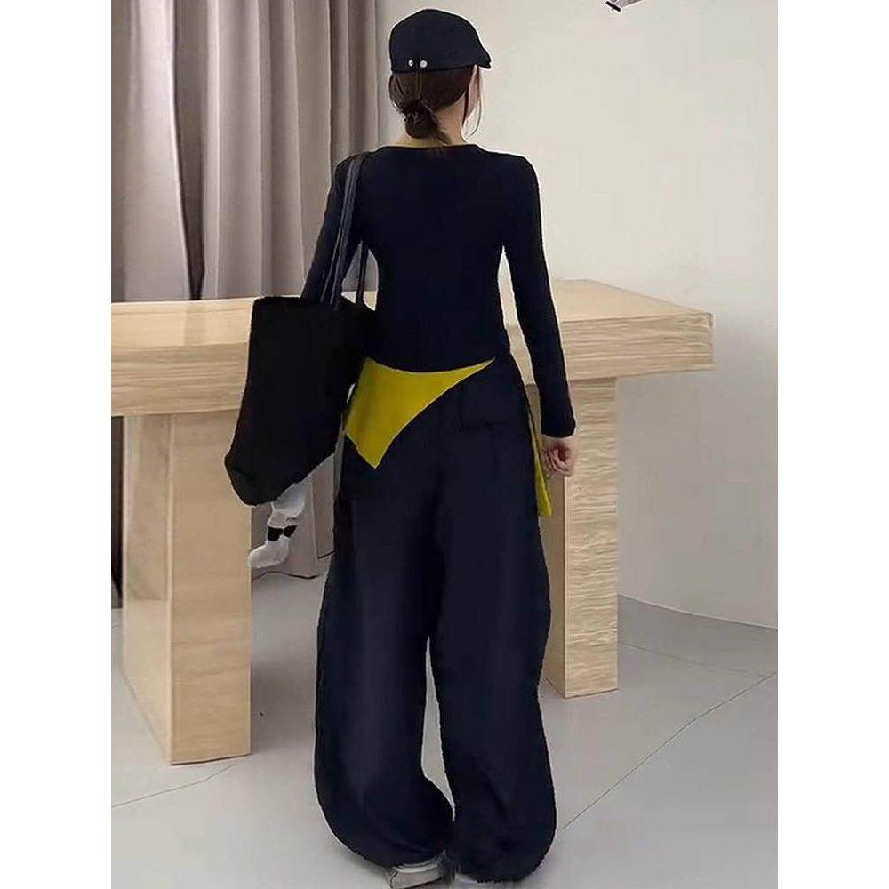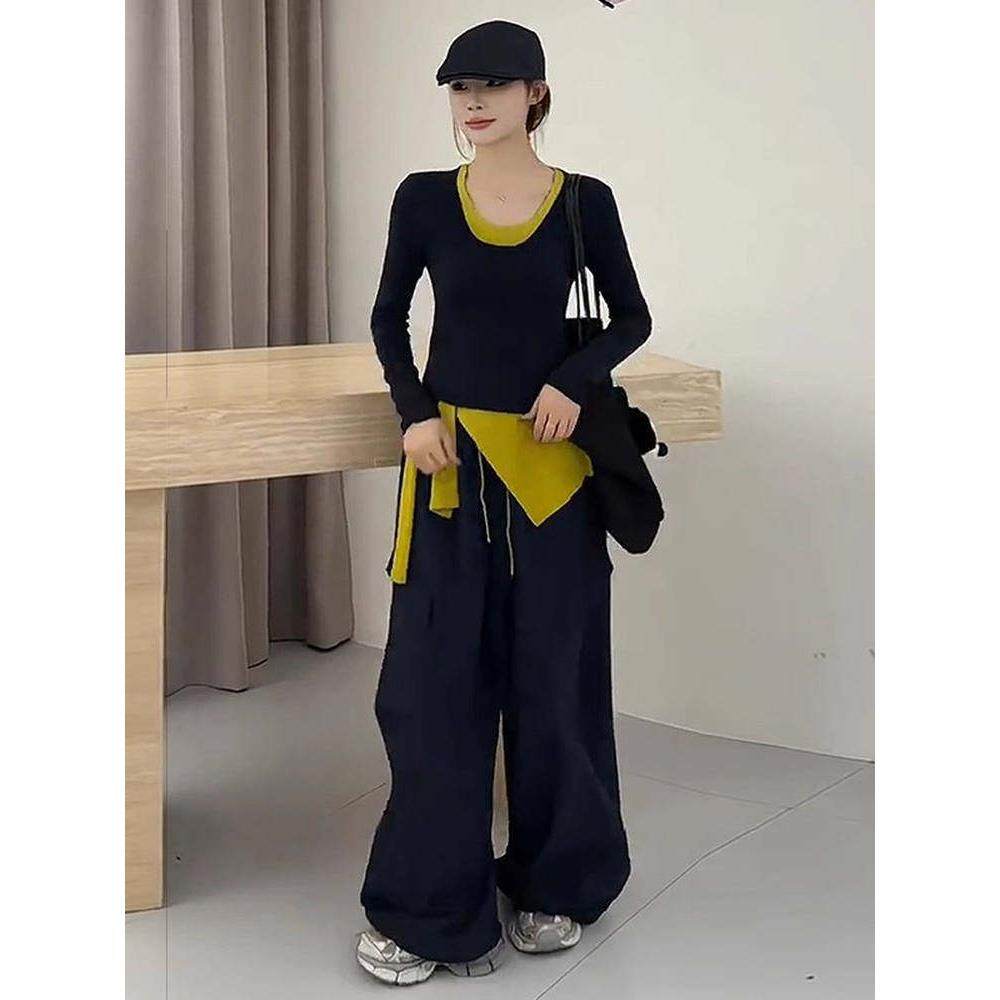香港代购时尚休闲套装女秋季新款显瘦假两件长袖上衣阔腿裤两件套