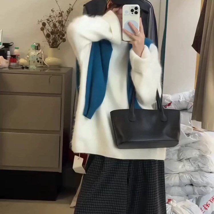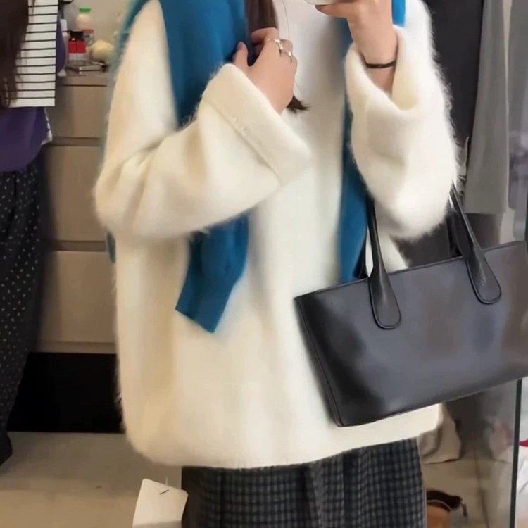 白色温柔慵懒风圆领长袖毛衣女2025秋季新款宽松套头毛针织衫上衣