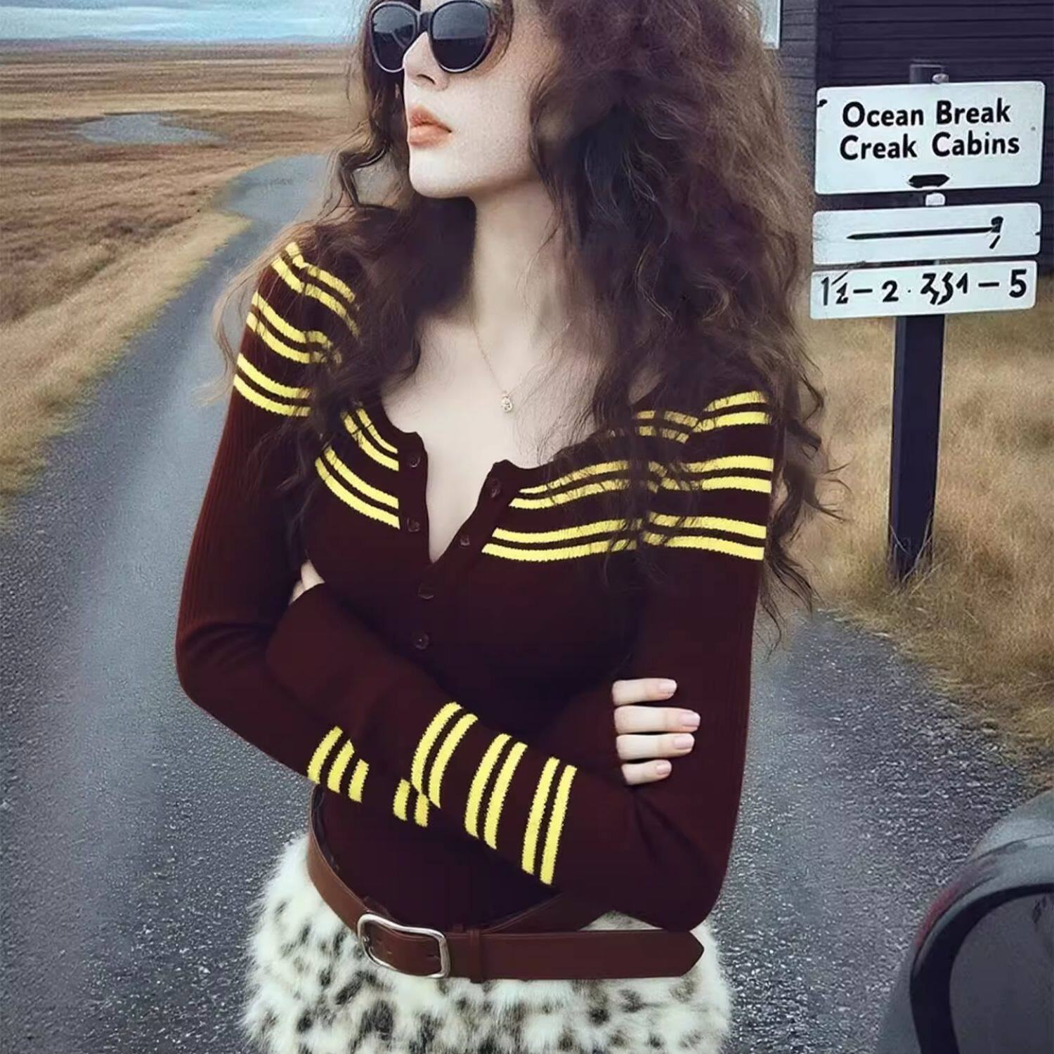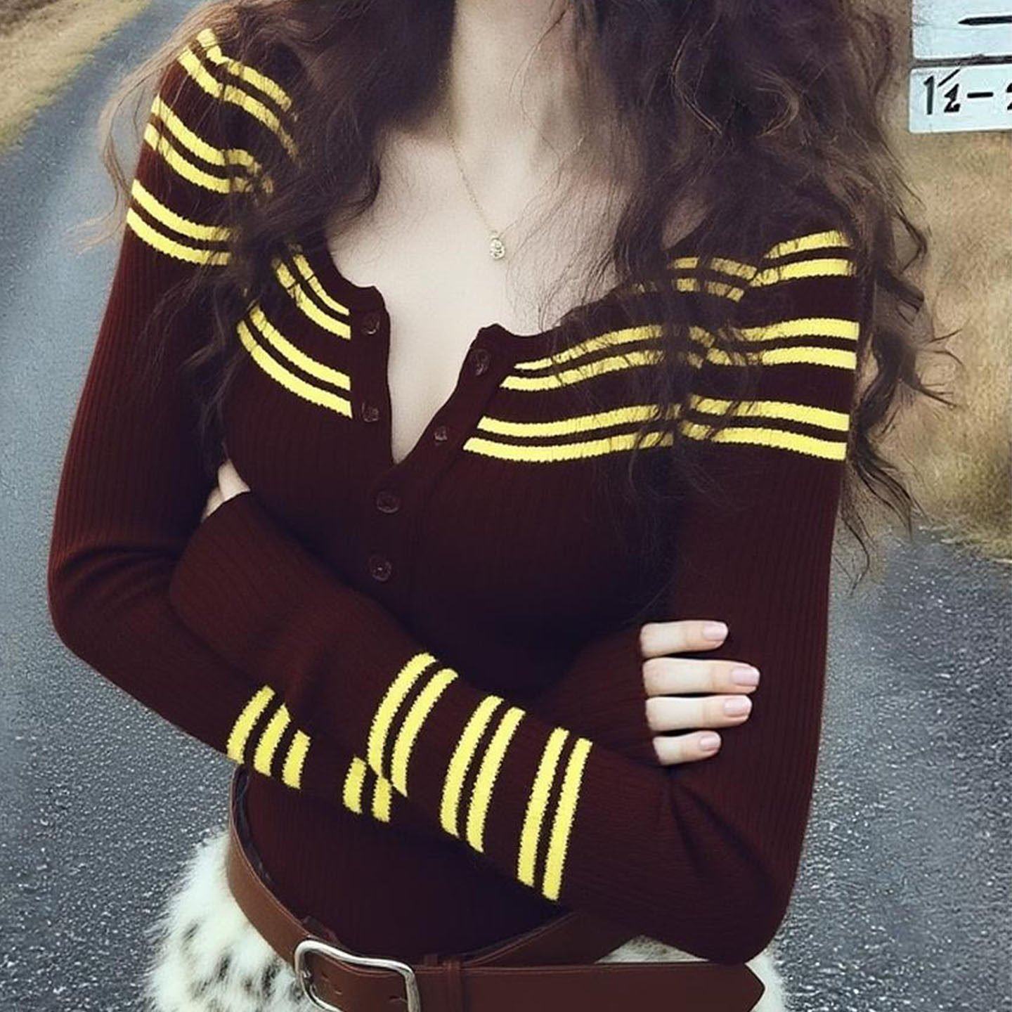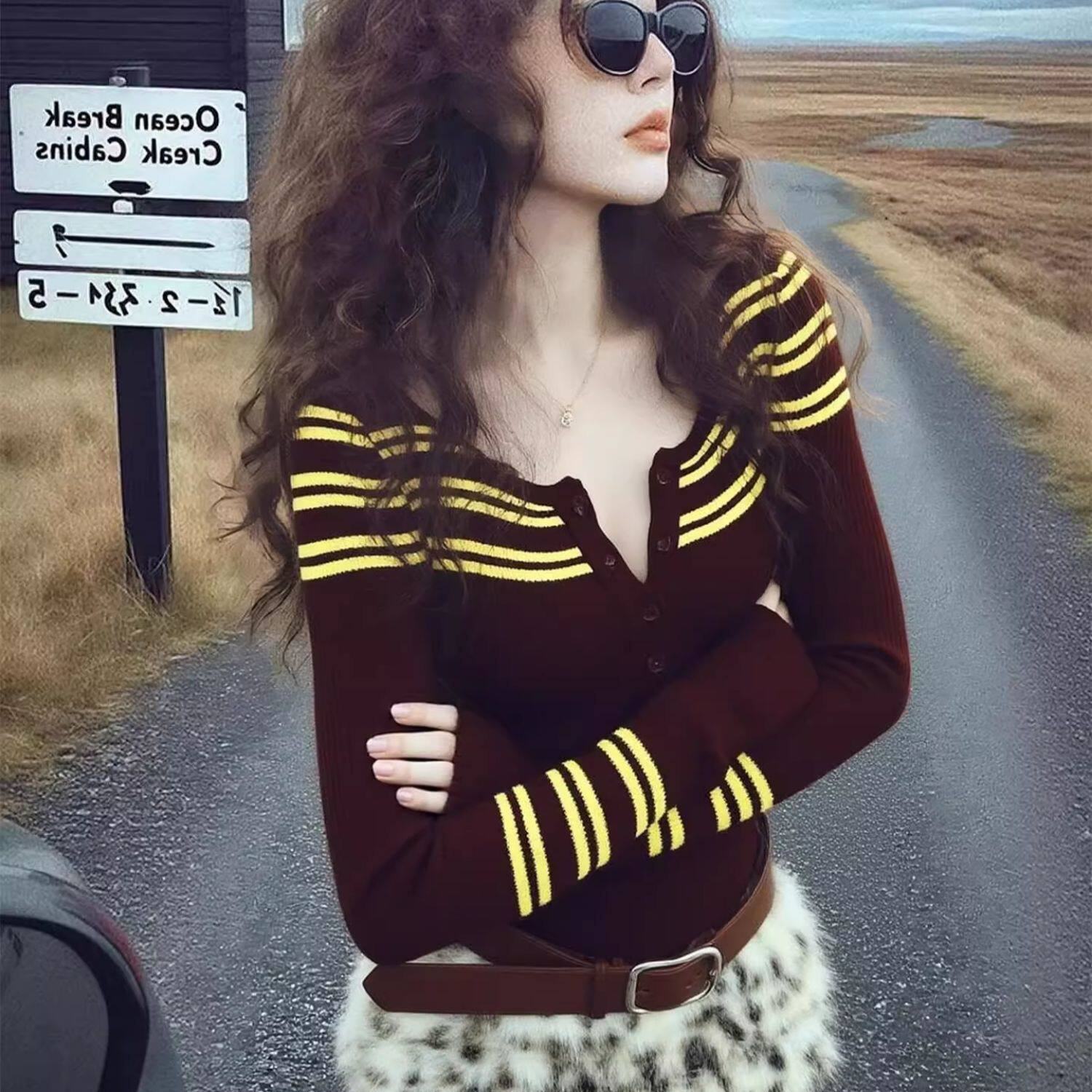 冬季韩里韩气上衣别致独特超好看洋气减龄漂亮高级感咖色条纹毛衣