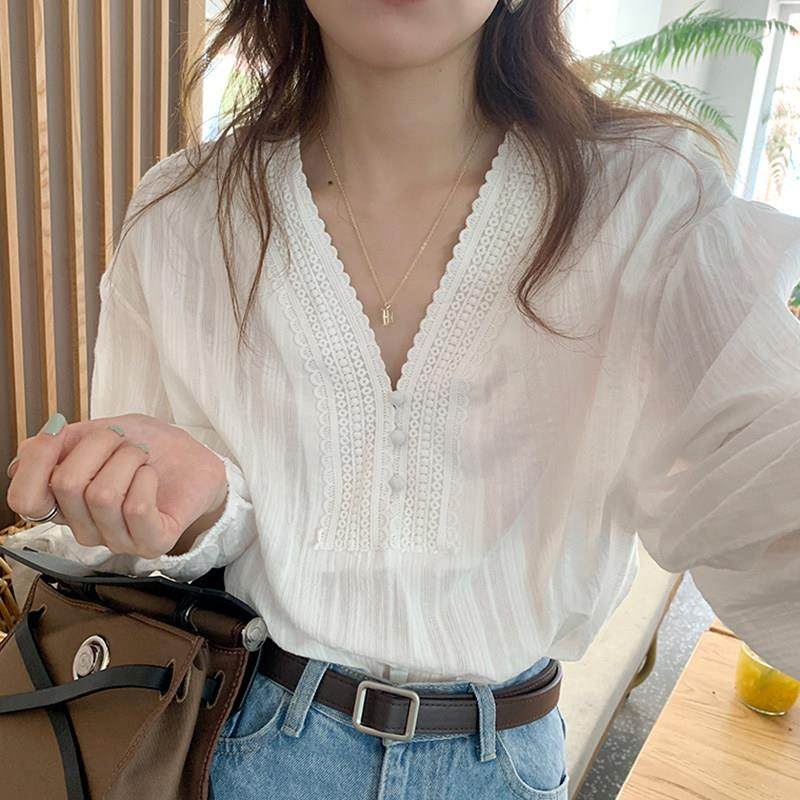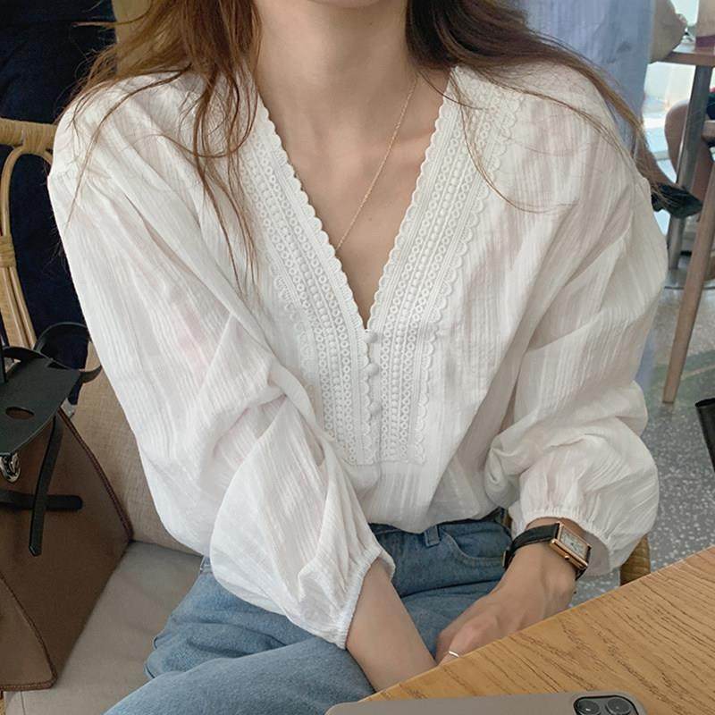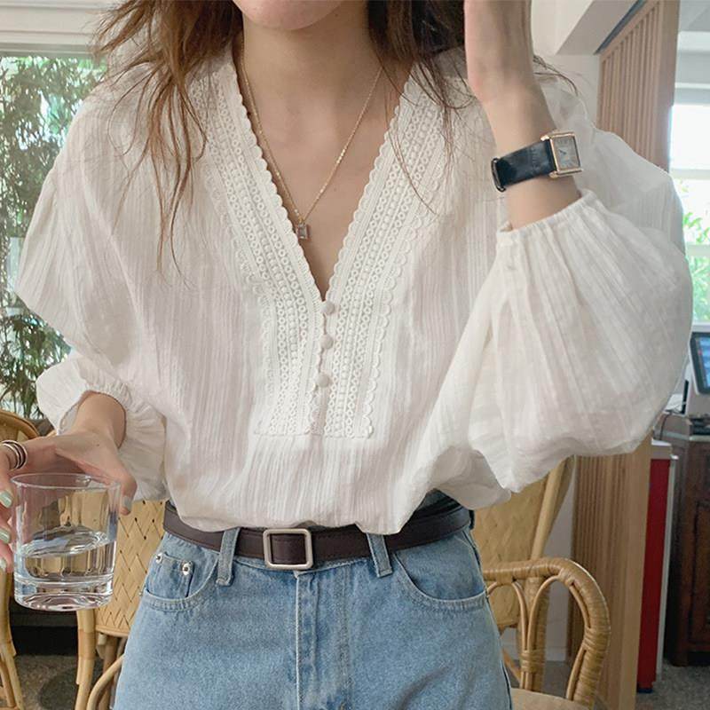 首页> 女装> 法国Rixo Rane温柔蕾丝花边拼接设计V领包边扣宽松泡泡袖衬衫上衣