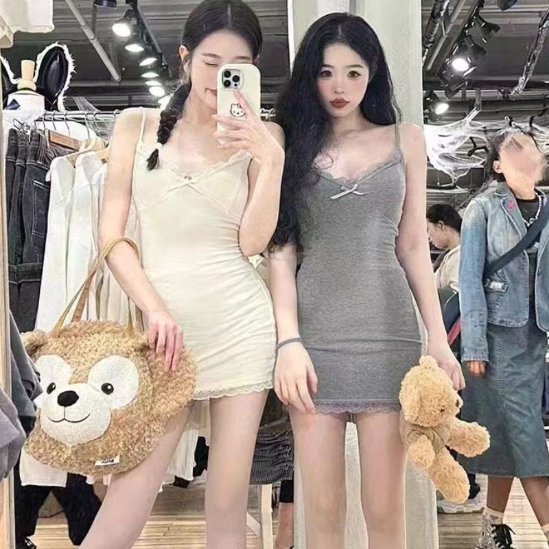 夏季ins风法式纯欲蝴蝶结蕾丝拼接吊带背心短裙大码胖妹妹连衣裙