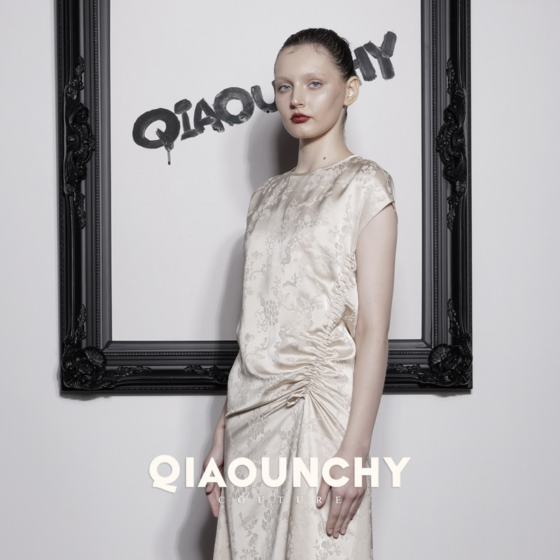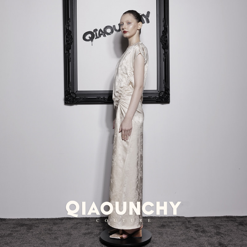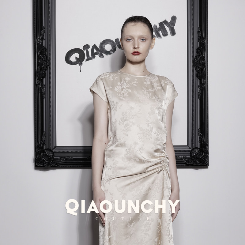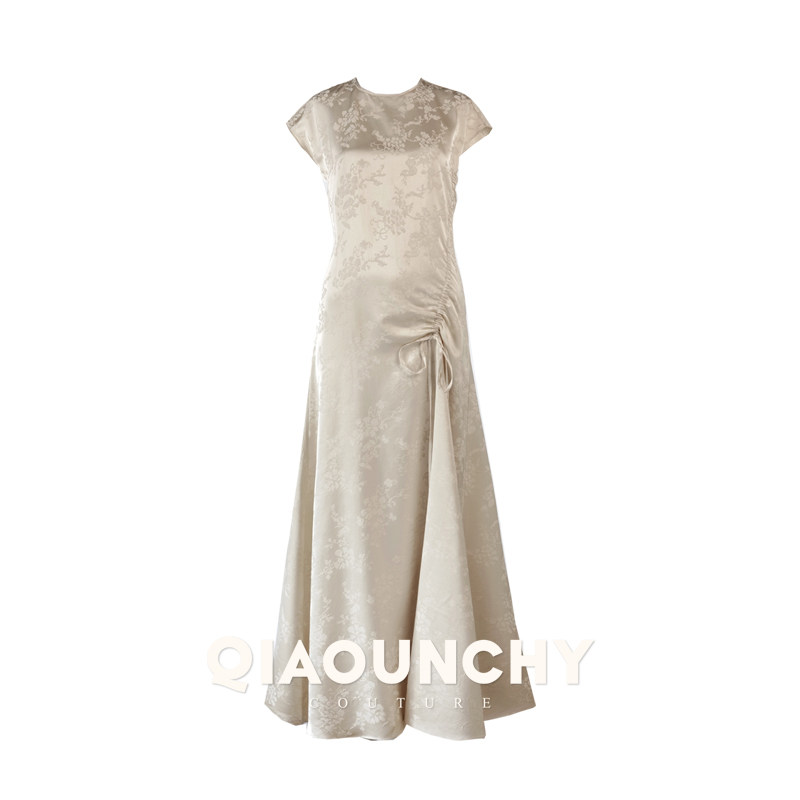 苏杭丝绸 QIAOUNCHY俏云曦|25秋长裙法式杏色暗纹提花抽绳连衣裙