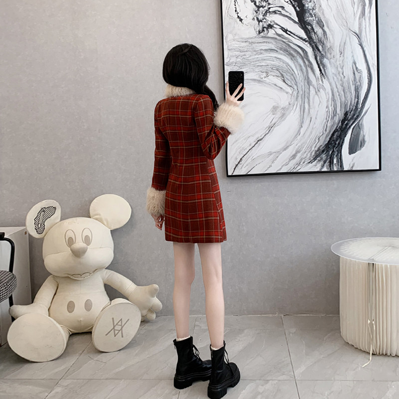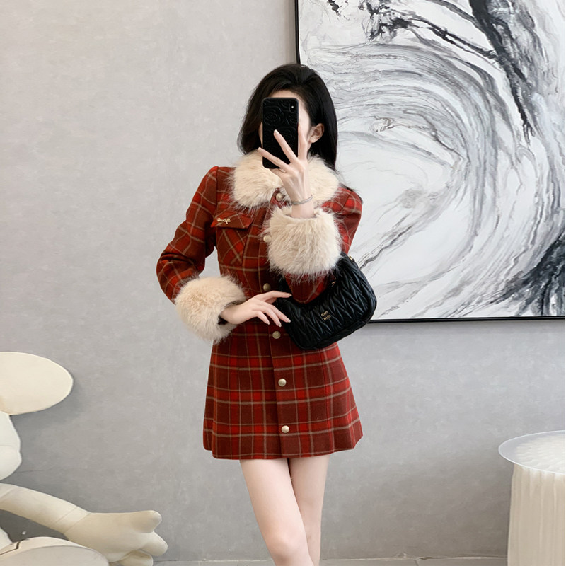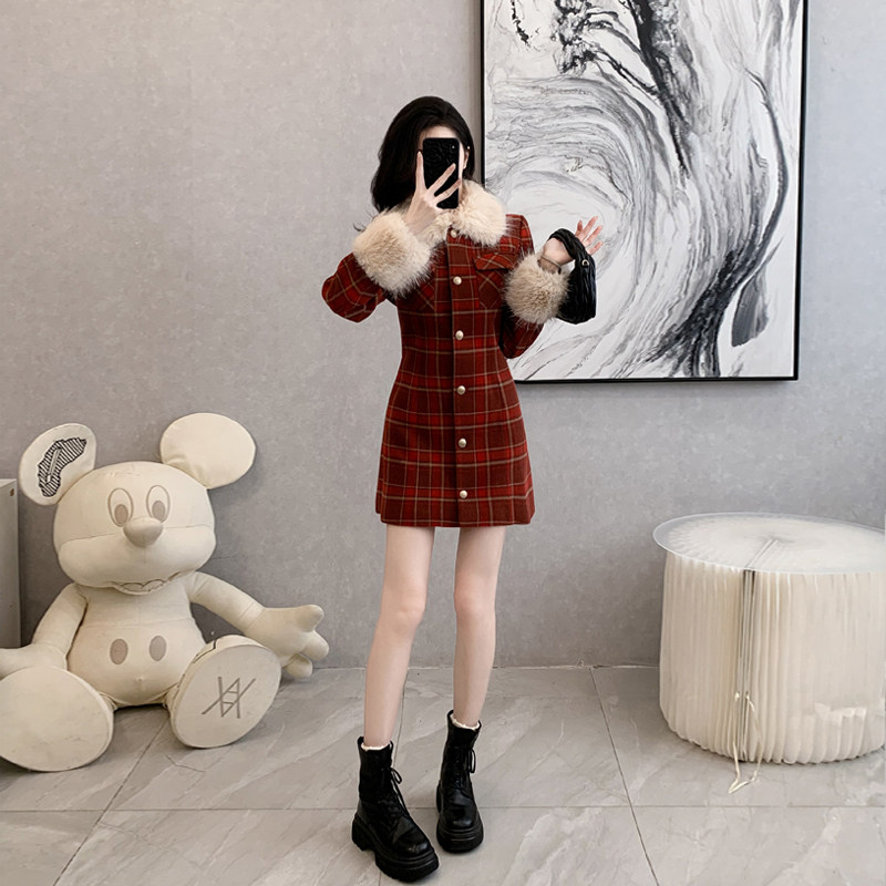 首页> 女装> 法式复古大毛领格子毛呢连衣裙女冬季新款学院风加厚呢子外套大衣