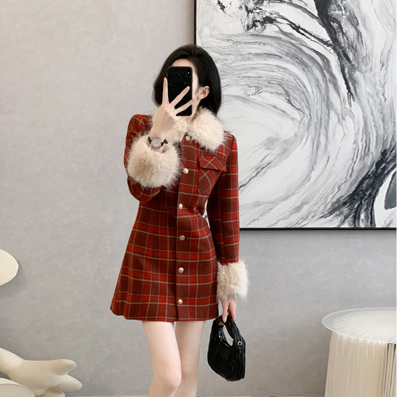 法式复古大毛领格子毛呢连衣裙女冬季新款学院风加厚呢子外套大衣