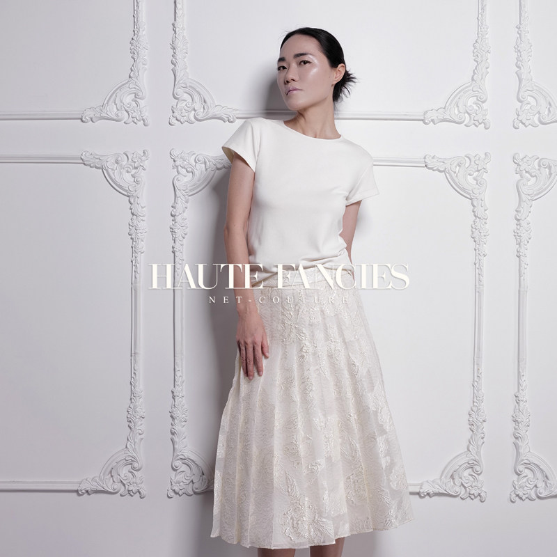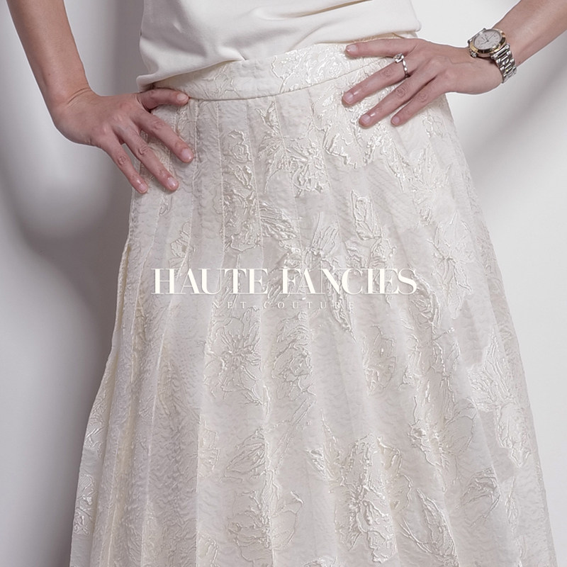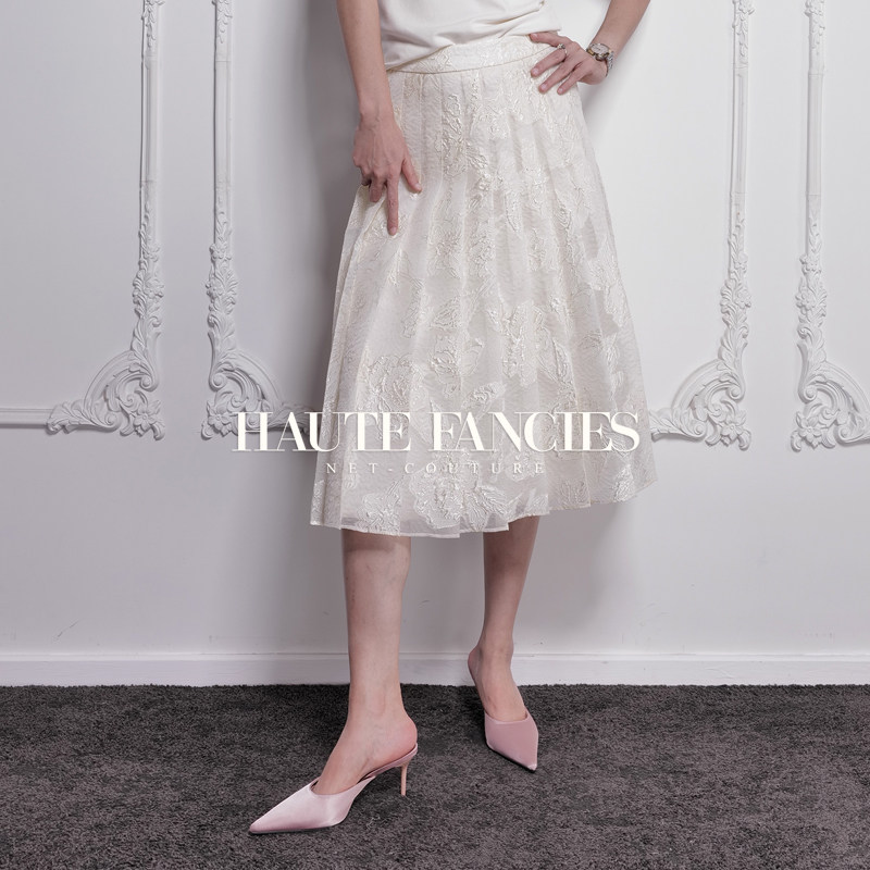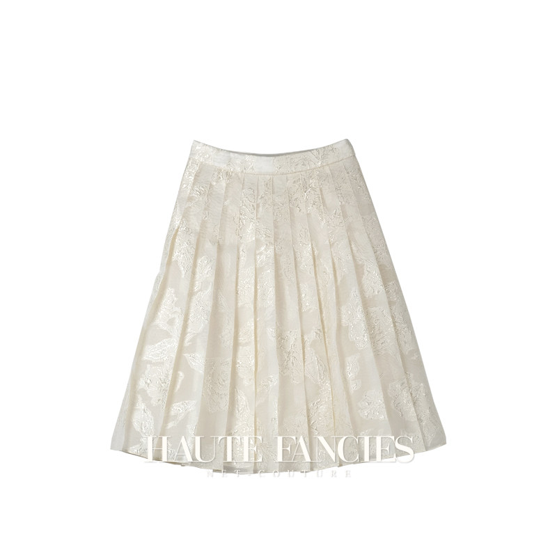 矜持 HAUTE FANCIES后构想|杏色真丝提花中长百褶裙高腰半身裙秋