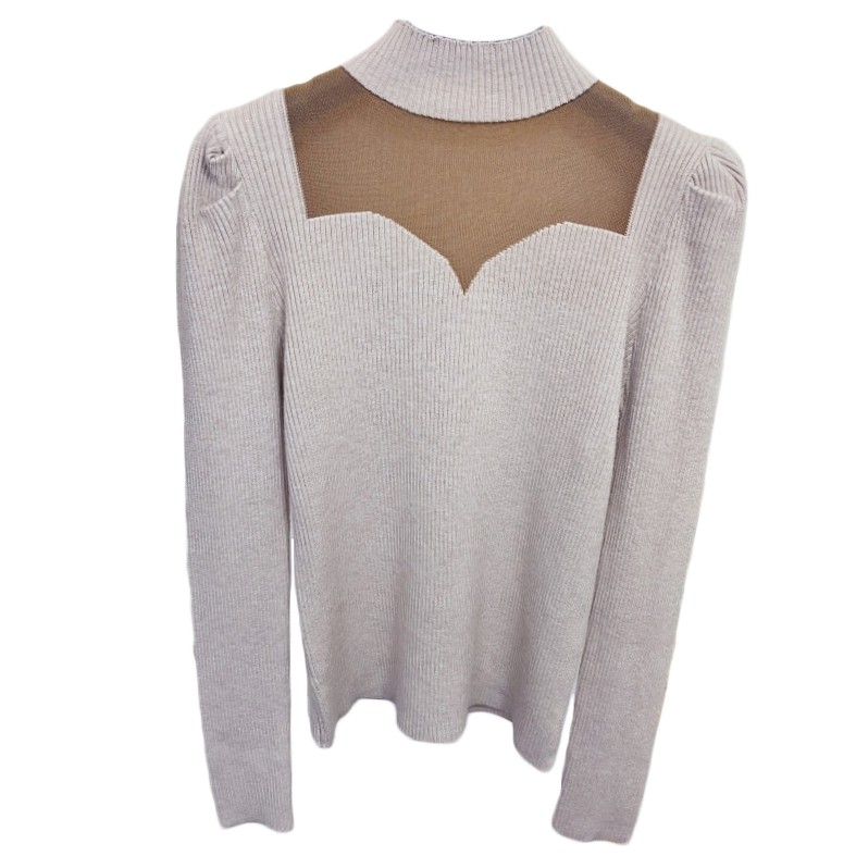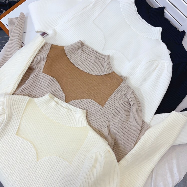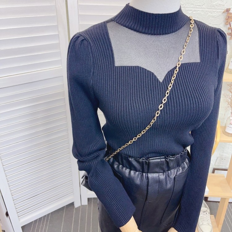 网纱拼接半高领针织打底衫女装秋冬新款洋气修身显瘦打底毛衣上衣