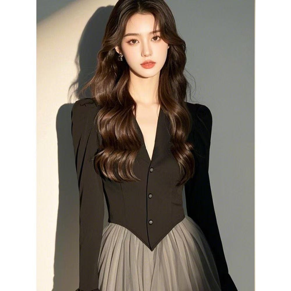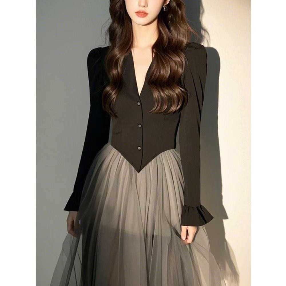 富家千金高级感穿搭赫本风黑色拼接网纱连衣裙子2025新款女装春季