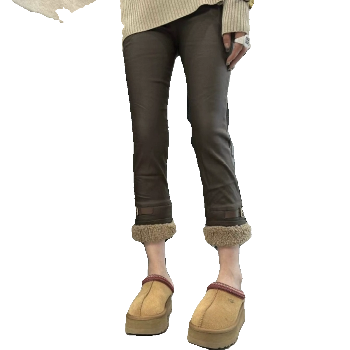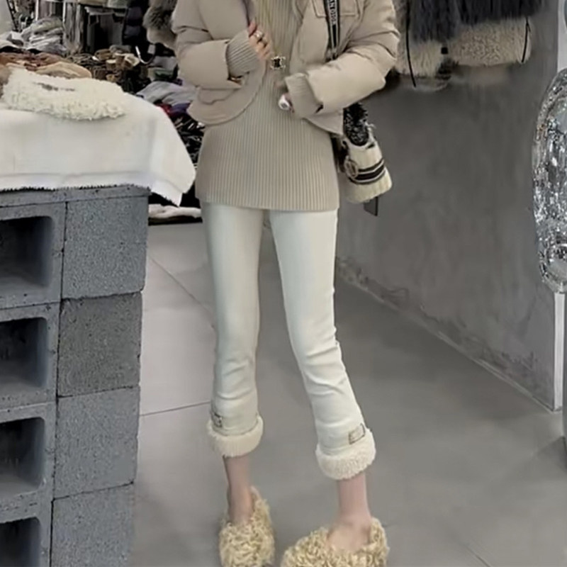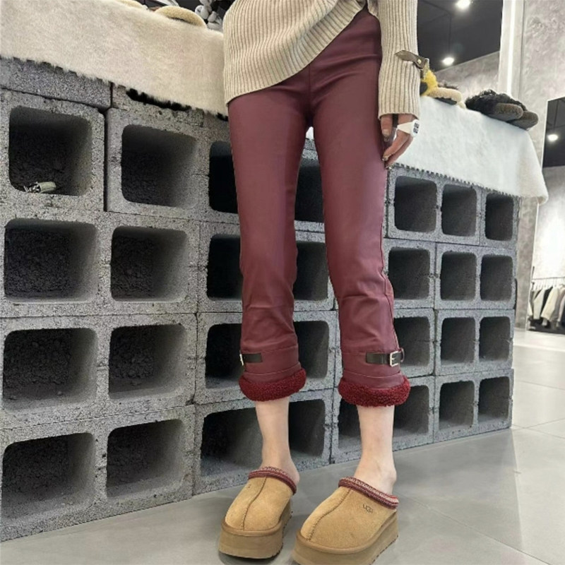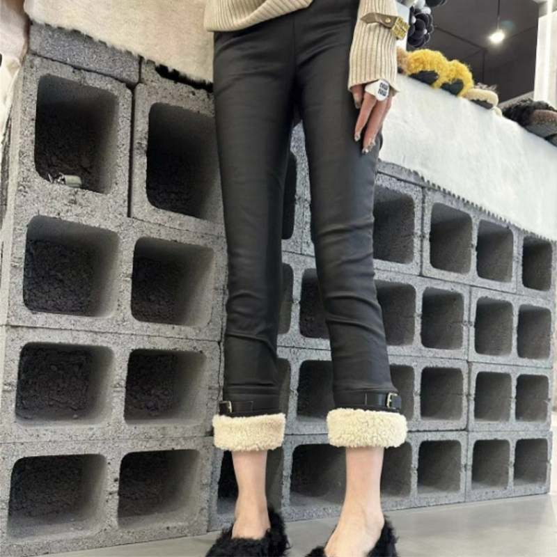 2023秋冬新款涂层裤子女加绒羊羔毛九分直筒铅笔裤烟管裤仿皮裤女